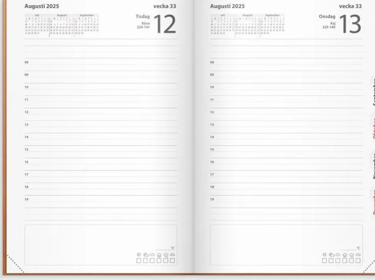 Kalender 2025 från Burde. Format: 135×205 mm. Layout: Dag/sida. Timindelning 8-19. Kalendarium: 2025-01-01 – 2025-12-31. Omslag: Konstläder. Inbunden. Detaljer: Märkband. Innehåll: Årsöversikter, årsplaner, urstansat månadsregister. Antal sidor: 400. Miljöinformation: FSC® papper.