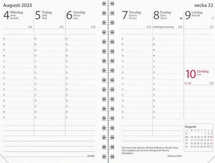 Kalender 2025 från Burde. Format: 83×127 mm. Layout: Stående. Vecka/uppslag. Timindelning 7-21. Kalendarium: 2024-12-09 – 2026-01-04. Omslag: Konstläder. Spiralbunden. Innehåll: Årsöversikter, årsplaner, telefonregister, atlas. Antal sidor: 152. Miljöinformation: FSC® papper.
