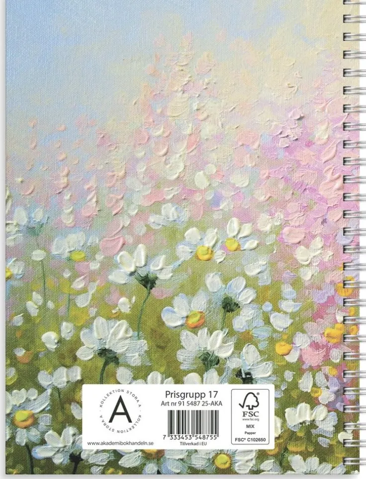 Kalender 2025 med ett omslag som påminner om en vacker målning av en blommande äng. Format: A5. Layout: Liggande. Vecka/Uppslag. Kalendarium: 2024-12-09 – 2026-01-04. Omslag: Strukturerad kartong. Spiralbunden. Miljöinformation: FSC®.