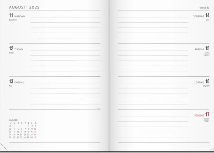 Kalender klädd i konstläder med struktur. Kalendern har ett uppslag med liggande layout där fokus ligger på tydlig veckoplanering. Inlagans layout passar dig som har mycket på gång, oavsett veckodag. Kalendern är enkel och tydlig med lika mycket utrymme för både vardag och helg.Kalender 2025 från Burde. Format: A5. Layout: Liggande. Vecka/uppslag. Kalendarium: 2024-12-09 – 2026-01-04. Omslag: Konstläder. Inbunden. Detaljer: Gummiband. Märkband. Innehåll: Årsöversikter, årsplaner. Antal sidor: 144. Miljöinformation: FSC®.