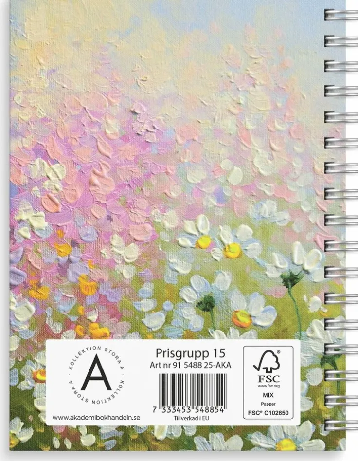 Kalender 2025 med ett omslag som påminner om en vacker målning av en blommande äng. Format: A6. Layout: Liggande. Vecka/Uppslag. Kalendarium: 2024-12-09 – 2026-01-04. Omslag: Strukturerad kartong. Spiralbunden. Miljöinformation: FSC®.