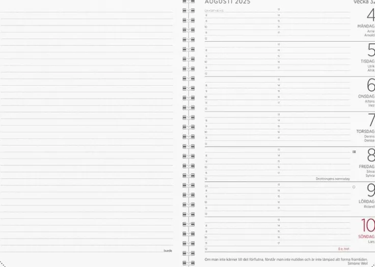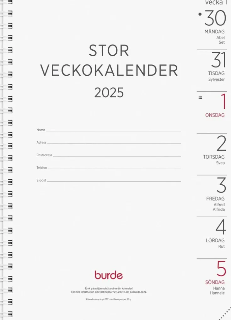 Kalender 2025 från Burde. Format: A5. Layout: Liggande. Vecka/uppslag. Timindelning 8-17. Kalendarium: 2024-12-23 – 2026-01-04. Omslag: Kartong. Spiralbunden. Innehåll: Årsplaner, linjerade vänstersidor, internationella helgdagar, löst telefonblad. Antal sidor: 112. Miljöinformation: FSC®.