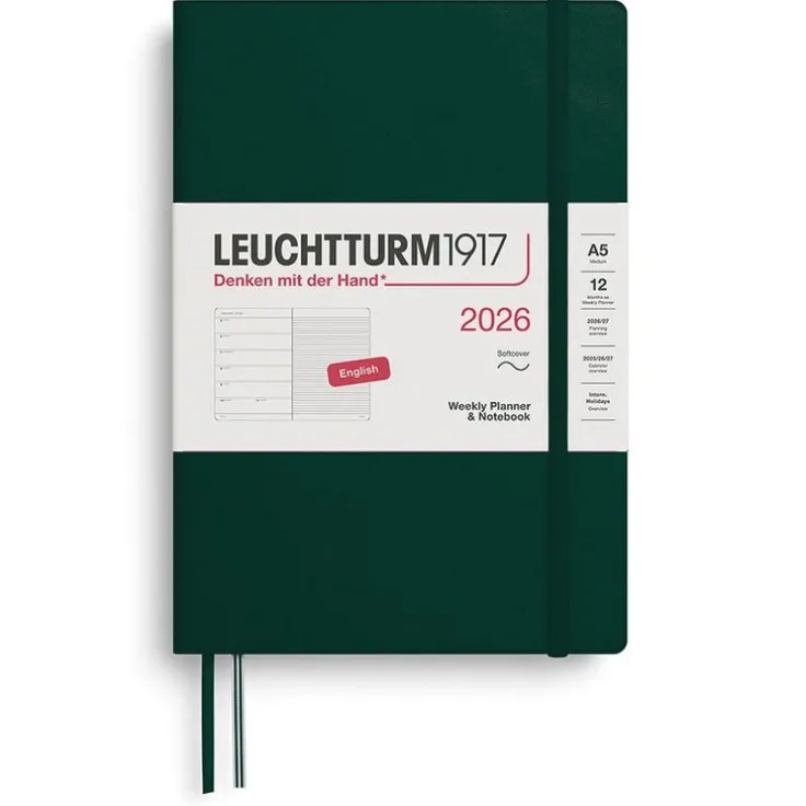 Kalender 2026 Leuchtturm1917 i A5-format med inbunden inlaga och mjuk pärm, Weekly Planner & Notebook med veckans dagar på vänster sida och prickat anteckningsblad på den högra sidan av ett uppslag – kalender och anteckningsbok i ett med gott om utrymme för daglig planering och organisering. Innehåller detaljer som 3 års årsöversikt, årsplanering 2026 & 2027, projektplanering, , kraftig förvaringsficka och avrivningsbara sidor längst bak, 2 märkband, internationella helgdagar vilket gör det lätt att hitta helgdagar i sitt eget land, praktiskt även vid planering av resor. Praktisk resårsnodd som håller ihop kalendern. FSC-certifierat och syrafritt papper. Färg: Forest Green