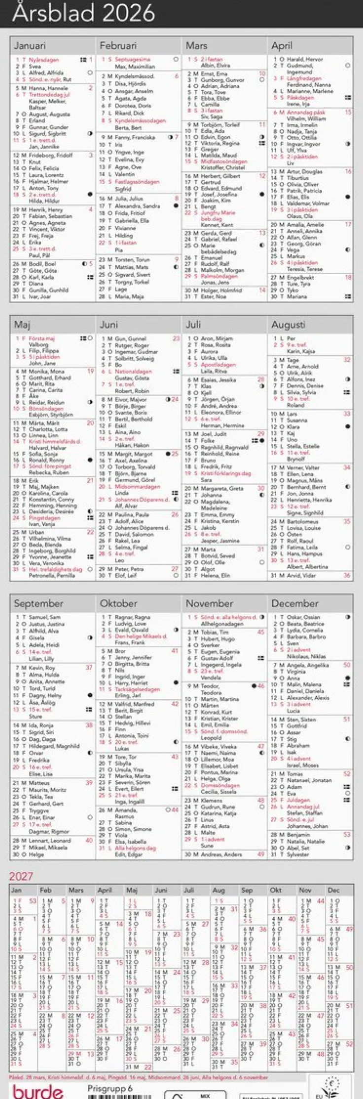 Kalender 2026 från Burde. Format: 120×366 mm. Layout: År/blad. Kalendarium: 2026-01-01 – 2026-12-31. Innehåll: Kyrkliga helgdagar, flaggdagar, helgdagar, månfaser, namnsdagar, årsöversikter föregående, innevarande och de tre följande åren,. Antal sidor: 2. Miljöinformation: FSC®. Ecolabel.