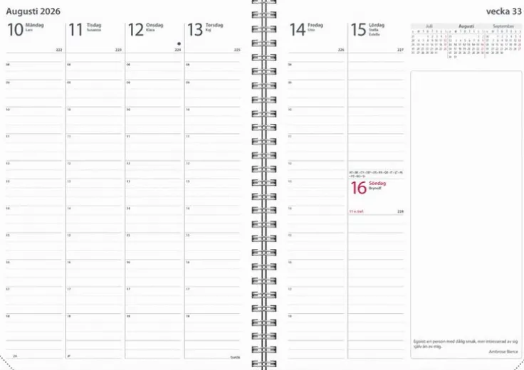 Kalender 2026 från Burde. Format: A5. Layout: Stående. Vecka/uppslag. Timindelning 8-18. Kalendarium: 2025-11-24 – 2027-01-03. Omslag: Återvunnen kartong. Spiralbunden. Innehåll: Kyrkliga helgdagar, flaggdagar, helgdagar/aftnar, internationella helgdagar, månfaser, namnsdagar, internationella helgdagar översikt, temadagar/händelser, årsöversikt/årsöversikter, årsplan/årsplaner,. Antal sidor: 144. Miljöinformation: FSC®. Omslag i återvunnen kartong. Tillverkad i Småland.