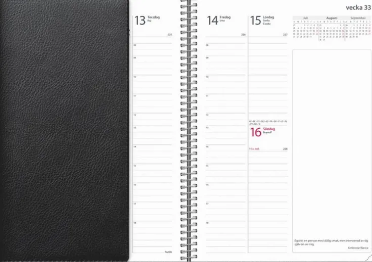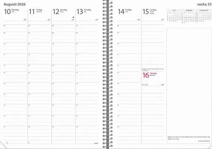 Kalender med mjuk pärm i konstläder med den populära flärpen som kan användas som bokmärke. Att ha flyt på jobbet handlar till stor del om konsten att planera. Det här är kalendern för dig som vet att arbetsdagen lätt blir hektiskt och snabbt fylls på med möten och uppgifter, och vill ha bra översikt över din veckoplanering. När du vet vad som väntar varje dag blir du mer effektiv och chansen är större att du når dina karriärmål.>Kalender 2026 från Burde. Format: A5. Layout: Stående. Vecka/uppslag. Timindelning 8-18. Kalendarium: 2025-11-24 – 2027-01-03. Omslag: Konstläder. Spiralbunden. Innehåll: Kyrkliga helgdagar, flaggdagar, helgdagar/aftnar, internationella helgdagar, månfaser, namnsdagar, internationella helgdagar översikt, temadagar/händelser, årsöversikt/årsöversikter, årsplan/årsplaner,. Antal sidor: 144. Miljöinformation: FSC® papper.