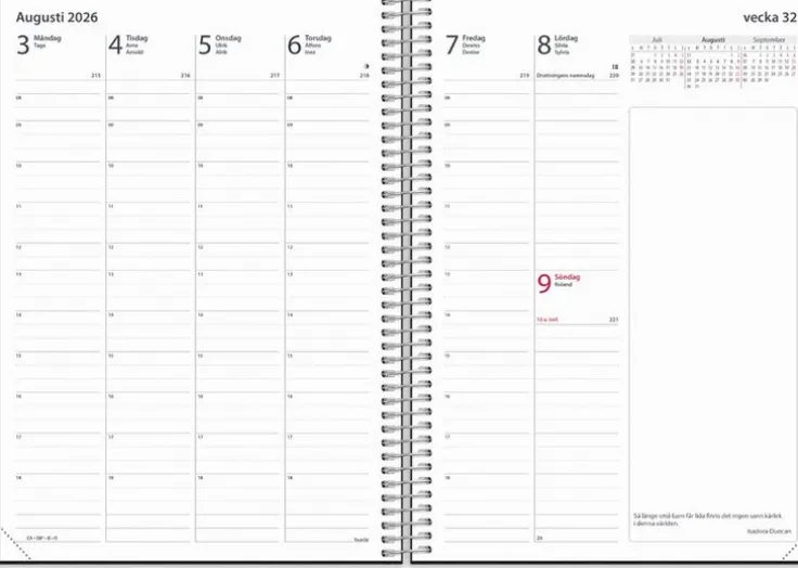 Kalender 2026 från Burde. Format: A5. Layout: Stående. Vecka/uppslag. Timindelning 8-18. Kalendarium: 2025-11-24 – 2027-01-03. Omslag: Konstläder. Spiralbunden. Detaljer: Pappersfickor. Innehåll: Kyrkliga helgdagar, flaggdagar, helgdagar/aftnar, internationella helgdagar, månfaser, namnsdagar, internationella helgdagar översikt, temadagar/händelser, årsöversikt/årsöversikter, årsplan/årsplaner, atlas, körjournal, utvikbar årsplan, utvikbar projektplan, anteckningssidor, plastflikar, projektarbete, aktier, telefonregister, to-do, underlag reseräkning. Antal sidor: 224. Miljöinformation: FSC®.