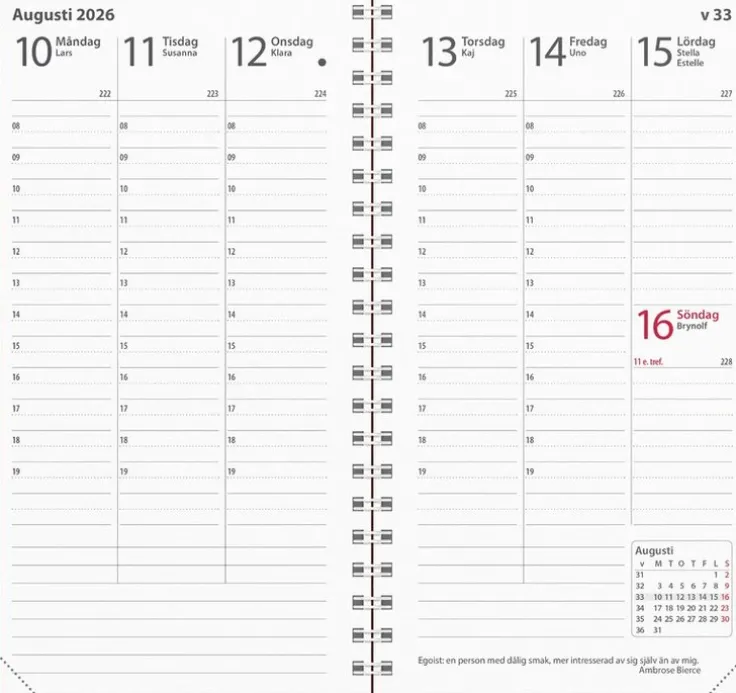 Kalender 2026 från Burde. Format: 83×158 mm. Layout: Stående. Vecka/uppslag. Timindelning 8-19. Kalendarium: 2025-12-22 – 2027-01-03. Omslag: Konstläder. Spiralbunden. Innehåll: Kyrkliga helgdagar, flaggdagar, helgdagar/aftnar, månfaser, namnsdagar, internationella helgdagar översikt, temadagar/händelser, årsöversikt/årsöversikter, årsplan/årsplaner, atlas, anteckningshäfte. Antal sidor: 128. Miljöinformation: FSC® papper.