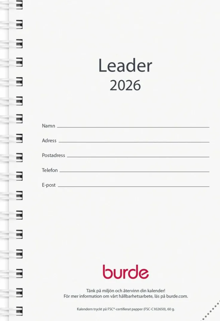 Kalender 2026 från Burde. Format: 83×127 mm. Layout: Liggande. Vecka/uppslag. Kalendarium: 2025-12-15 – 2027-01-03. Omslag: Kartong. Spiralbunden. Innehåll: Kyrkliga helgdagar, flaggdagar, helgdagar/aftnar, månfaser, namnsdagar, internationella helgdagar översikt, temadagar/händelser, årsöversikt/årsöversikter, årsplan/årsplaner, atlas. Antal sidor: 152. Miljöinformation: FSC®.