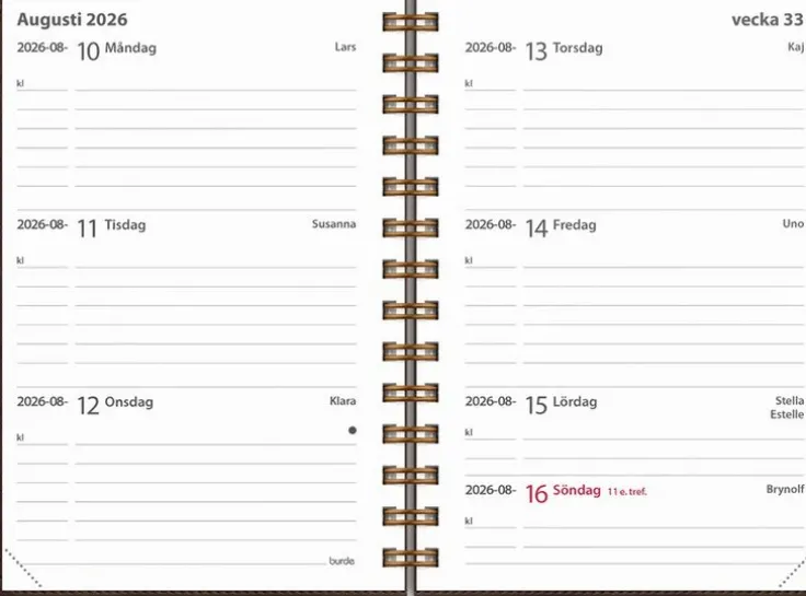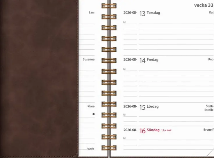 Kalender med mjuk pärm i konstläder med den populära flärpen som kan användas som bokmärke. Den lilla praktiska veckokalendern!>Kalender 2026 från Burde. Format: 83×127 mm. Layout: Liggande. Vecka/uppslag. Kalendarium: 2025-12-15 – 2027-01-03. Omslag: Konstläder. Spiralbunden. Innehåll: Kyrkliga helgdagar, flaggdagar, helgdagar/aftnar, månfaser, namnsdagar, internationella helgdagar översikt, temadagar/händelser, årsöversikt/årsöversikter, årsplan/årsplaner, atlas. Antal sidor: 128. Miljöinformation: FSC® papper.