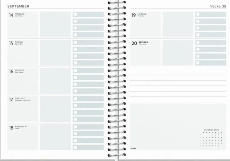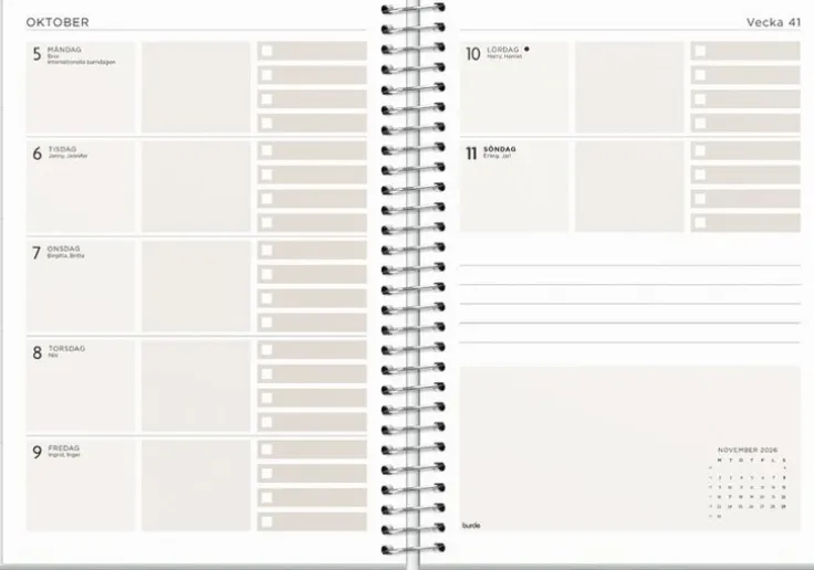 När du har mycket att hålla reda på är det tryggt att ha ett verktyg som på riktigt hjälper dig att strukturera din tid. Life Organizer är en trendig kalender med veckoplanering och tydlig månadsöversikt, för dig som vill ha med dig ditt liv överallt! Här får du gott om plats att planera dina dagar, skriva listor, kom ihåg och reflektera över livet. Kalendern har smarta flikar som delar in månaderna och flera ark med klistermärken så du kan piffa lite extra. Gör planeringen till en livsstil du också!>Kalender 2026 från Burde. Format: C5. Layout: Liggande. Vecka/uppslag. Kalendarium: 2025-12-29 – 2027-01-03. Omslag: Kartong med struktur. Spiralbunden. Detaljer: Pappersficka. Innehåll: Flaggdagar, helgdagar/aftnar, månfaser, namnsdagar, temadagar/händelser, årsöversikt/årsöversikter, årsplan/årsplaner, anteckningssidor, stickersark. Antal sidor: 176. Miljöinformation: FSC®.