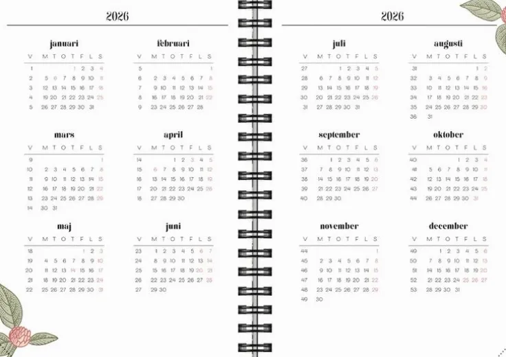 En komplett livsplanerare i litet format som du med lätthet bär med dig genom din vardag!>Kalender 2026 från Burde. Format: A6. Layout: Liggande. Vecka/uppslag. Kalendarium: 2025-12-22 – 2027-01-03. Omslag: Kartong med struktur. Spiralbunden. Detaljer: Gummiband. Innehåll: Flaggdagar, helgdagar/aftnar, månadsöversikt, månfaser, namnsdagar, temadagar/händelser, årsöversikt/årsöversikter, månadens to-do lista, anteckningssidor linjerade, citat, to-do. Antal sidor: 144. Miljöinformation: FSC®.