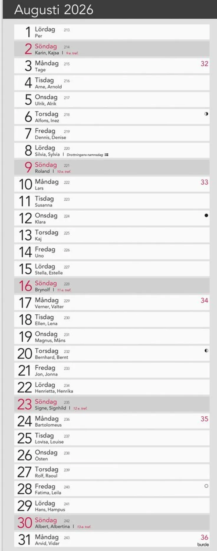 Kalender 2026 från Burde. Format: 115×295 mm. Layout: Månad/blad. Kalendarium: 2026-01-01 – 2026-12-31. Limbunden. Innehåll: Kyrkliga helgdagar, flaggdagar, helgdagar/aftnar, månfaser, namnsdagar, temadagar/händelser, årsöversikt/årsöversikter,. Antal sidor: 24. Miljöinformation: FSC®. Klimatkompenserad.
