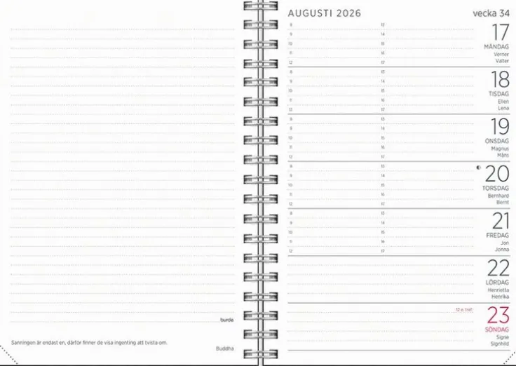 Kalender 2026 från Burde. Format: A6. Layout: Liggande. Vecka/uppslag. Timindelning 8-17. Kalendarium: 2025-12-08 – 2027-01-03. Omslag: Kartong. Spiralbunden. Innehåll: Kyrkliga helgdagar, flaggdagar, helgdagar/aftnar, månfaser, namnsdagar, internationella helgdagar översikt, temadagar/händelser, årsöversikt/årsöversikter, årsplan/årsplaner, inbundet telefonregister, linjerade vänstersidor. Antal sidor: 144. Miljöinformation: FSC®.