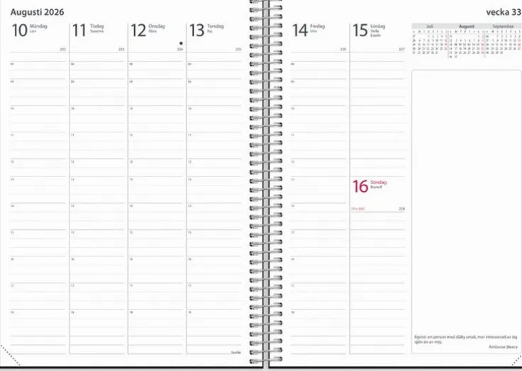 En A5 veckokalender med mycket plats för anteckningar och noteringar som innehåller vartannat uppslag veckokalender och vartannat anteckningssidor. Stående layout med timindelning så att du med lätthet kan planera och strukturera din dag!>Kalender 2026 från Burde. Format: A5. Layout: Stående. Vecka/uppslag. Timindelning 8-18. Kalendarium: 2025-12-22 – 2027-01-03. Omslag: Konstläder. Spiralbunden. Detaljer: Märkband. Flyttbar plastlinjal. Pappersficka. Innehåll: Kyrkliga helgdagar, flaggdagar, helgdagar/aftnar, månfaser, namnsdagar, temadagar/händelser, årsöversikt/årsöversikter, årsplan/årsplaner, utvikbar projektplan. Antal sidor: 240. Miljöinformation: FSC®.
