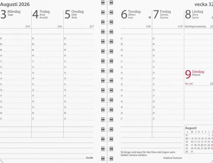 Kalender 2026 från Burde. Format: 83×127 mm. Layout: Stående. Vecka/uppslag. Timindelning 7-21. Kalendarium: 2025-12-08 – 2027-01-03. Omslag: Kartong. Spiralbunden. Innehåll: Kyrkliga helgdagar, flaggdagar, helgdagar/aftnar, månfaser, namnsdagar, internationella helgdagar översikt, temadagar/händelser, årsöversikt/årsöversikter, årsplan/årsplaner, atlas. Antal sidor: 152. Miljöinformation: FSC®.