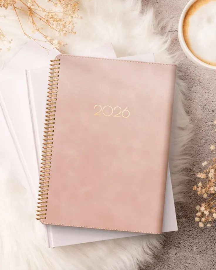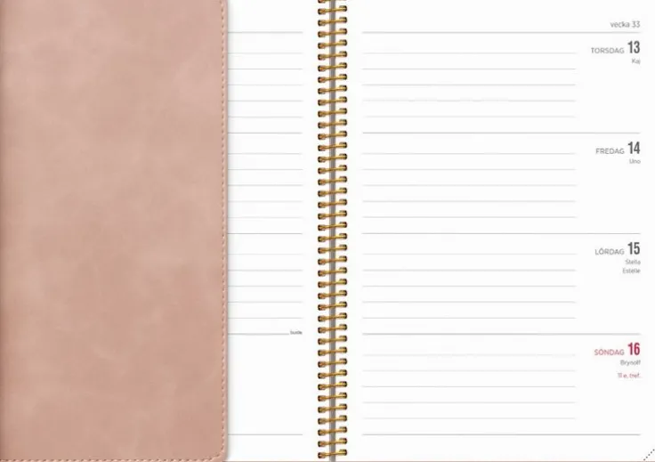Kalender med mjuk pärm i konstläder med den populära flärpen som kan användas som bokmärke. Kalendern har ett uppslag med liggande layout där fokus ligger på tydlig veckoplanering. Inlagans layout passar dig som har mycket på gång, oavsett veckodag. Kalendern är enkel och tydlig med lika mycket utrymme för både vardag och helg.>Kalender 2026 från Burde. Format: A5. Layout: Liggande. Vecka/uppslag. Kalendarium: 2025-12-08 – 2027-01-03. Omslag: Konstläder. Spiralbunden. Innehåll: Kyrkliga helgdagar, flaggdagar, helgdagar/aftnar, månfaser, namnsdagar, temadagar/händelser, årsöversikt/årsöversikter, årsplan/årsplaner,. Antal sidor: 144. Miljöinformation: FSC® papper.