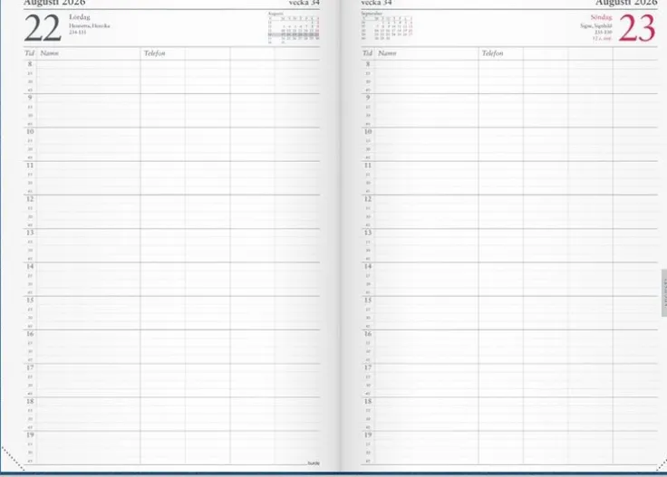 Kalender 2026 från Burde. Format: 180×265 mm. Layout: Dag/sida. Kvartsindelning 8-20. Kalendarium: 2026-01-01 – 2026-12-31. Omslag: Kartong. Inbunden. Detaljer: Märkband. Innehåll: Flaggdagar, helgdagar/aftnar, månfaser, namnsdagar, temadagar/händelser, årsöversikt/årsöversikter, årsplan/årsplaner, 5 kolumner. Antal sidor: 368. Miljöinformation: FSC®.