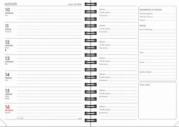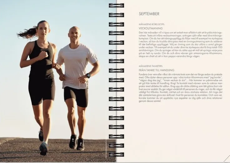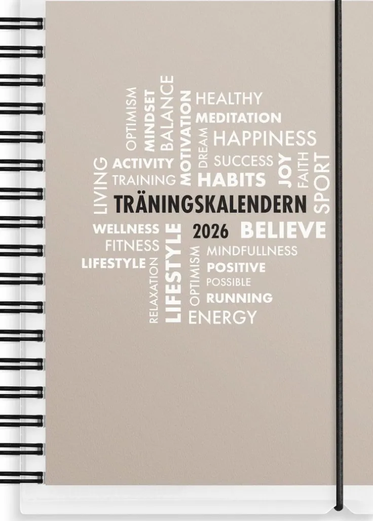 Träningskalendern hjälper dig att få sunda vanor i din vardag, men även att behålla dem över tid. Kalendern passar dig som vill ha en allsidig träning med en kombination av löpning och styrketräning. Det ingår även ett program för dig som vill komma i gång med meditation och andningsövningar så att den mentala träningen blir en naturlig del av din vardag också. Båda programmen är signerade löpcoachen och PT:n Jenny Sunding. Jenny ger också hälsosamma tips som håller inspirationen vid liv hela året. På varje uppslag finns dels en kalendersida med veckoplanering och dels en aktivitetssida. Träningskalendern har ett funktionellt plastomslag för att kunna följa med dig på träningspassen och även 2 framsidor att växla mellan.>Kalender 2026 från Burde. Format: A6. Layout: Liggande. Vecka/uppslag. Kalendarium: 2025-12-22 – 2027-01-03. Omslag: PP-plast. Spiralbunden. Detaljer: Gummiband. Innehåll: Kyrkliga helgdagar, flaggdagar, helgdagar/aftnar, månfaser, namnsdagar, temadagar/händelser, årsplan/årsplaner,. Antal sidor: 160. Miljöinformation: FSC®.