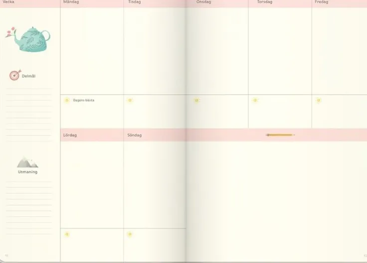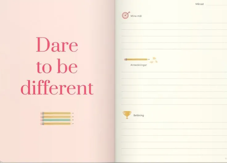 Ett odaterat planeringsverktyg för att uppnå dina drömmar och nå dina mål, med plats för att själv fylla i dina datum. Kalendern innehåller målsättningar, reflektioner, mood boards, checklistor, bucket lists, födelsedagar och anteckningar. Du kan sätta upp mål för ditt år, din månad och din vecka och skriva ner månadens prestationer, utmaningar och förbättringar. Kalendern innehåller även prickade sidor för att locka fram användarens kreativa sidor.Två märkband och cremefärgat papper i inlagan.Format: 163×229 mm. Layout: Rutor. Vecka/uppslag. Omslag: Kartong med struktur. Inbunden. Detaljer: Gummiband. Märkband. Innehåll: Födelsedagslista, Bucketlist, Checklista, Mål, Moodboard, Anteckningssidor prickade, Anteckningssidor linjerade, Reflektioner, Årsplaner. Antal sidor: 256. Pappersvikt: 100 g. Miljöinformation: FSC®.