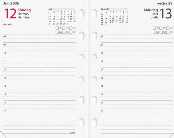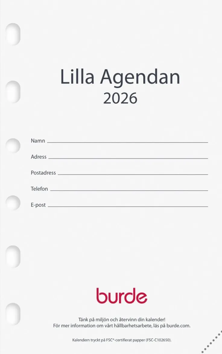 Hålad kalenderrefill till systemkalender med ringmekanism.>Kalender 2026 från Burde. Format: 79×127 mm. Layout: Stående. Dag/sida. Timindelning 8-17. Kalendarium: 2025-11-10 – 2027-01-24. Omslag: Kartong. Innehåll: Kyrkliga helgdagar, flaggdagar, helgdagar/aftnar, månfaser, namnsdagar, internationella helgdagar översikt, temadagar/händelser, årsöversikt/årsöversikter, årsplan/årsplaner,. Antal sidor: 384. Miljöinformation: FSC®.
