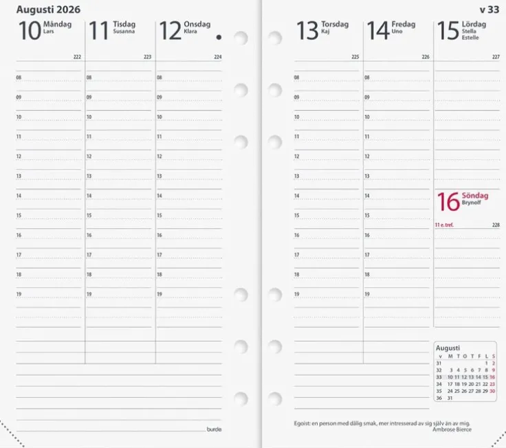 Hålad kalenderrefill till systemkalender med ringmekanism.>Kalender 2026 från Burde. Format: 95×170 mm. Layout: Stående. Vecka/uppslag. Timindelning 8-19. Kalendarium: 2025-12-22 – 2027-01-03. Omslag: Kartong. Innehåll: Kyrkliga helgdagar, flaggdagar, helgdagar/aftnar, månfaser, namnsdagar, internationella helgdagar översikt, temadagar/händelser, årsöversikt/årsöversikter, årsplan/årsplaner,. Antal sidor: 128. Miljöinformation: FSC®.