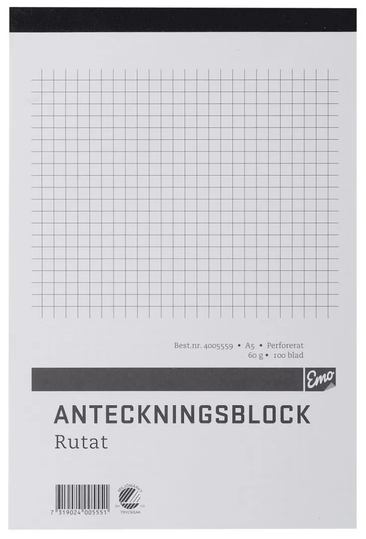 Anteckningsblock häftade på stödskiva. Skrivpapper. Perforerade. A5, rutat, ohålat, 60 g, 100 blad.