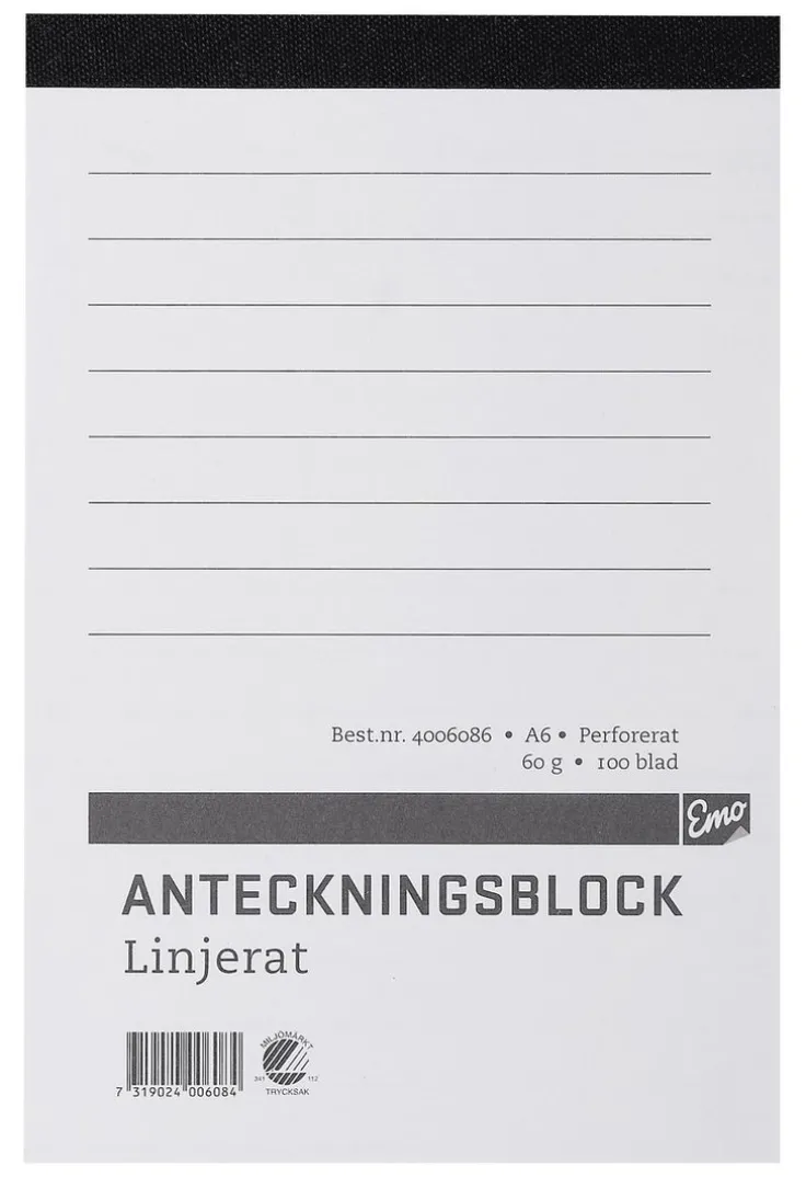 Anteckningsblock häftade på stödskiva. Skrivpapper. Perforerade. A6, linjerat, ohålat, 60 g, 100 blad.
