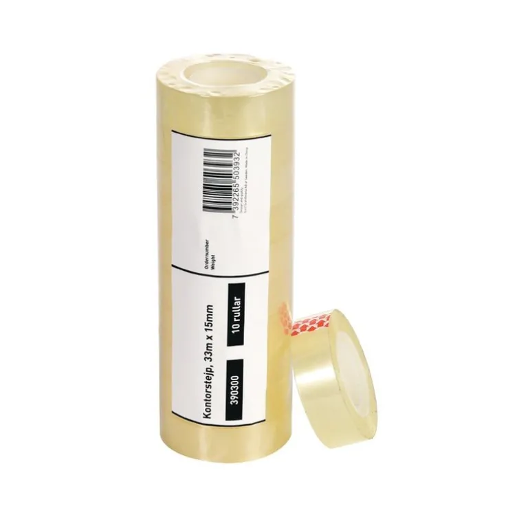 Semitransparent kontorstejp av bra kvalitet med kärna i plast. Allround tejp för kontor, hem, skola och emballering. Mått: 33 m x 15mm. Material: PP. Levereras i sampack 10 rullar.