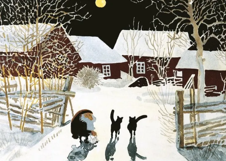 Harald Wibergs vinterbild med tomte och katter i månsken