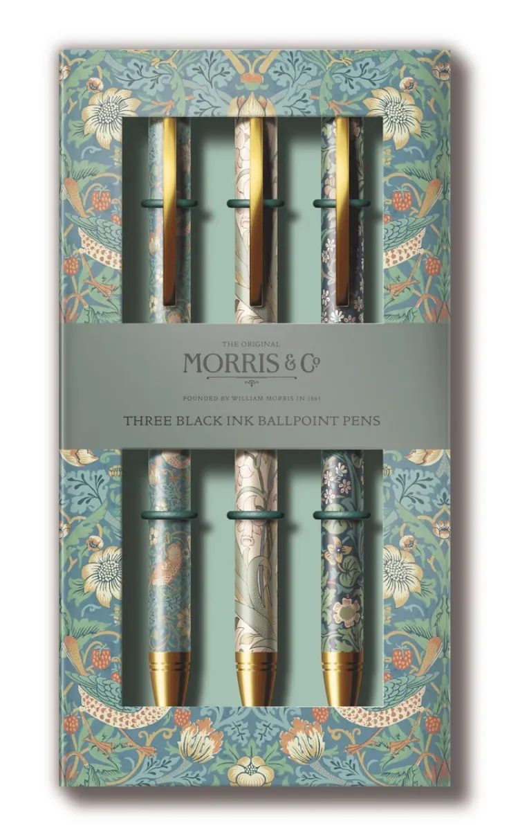 Ask med tre kulspetspennor i William Morris mönster. Varje penna har ett eget mönster. Pennorna har ett svart bläck och pennspetsen skruvas fram. Topp och spets är i guldfärg och ligger fint i handen. Pennorna är tillverkade under licens av Morris & Co.