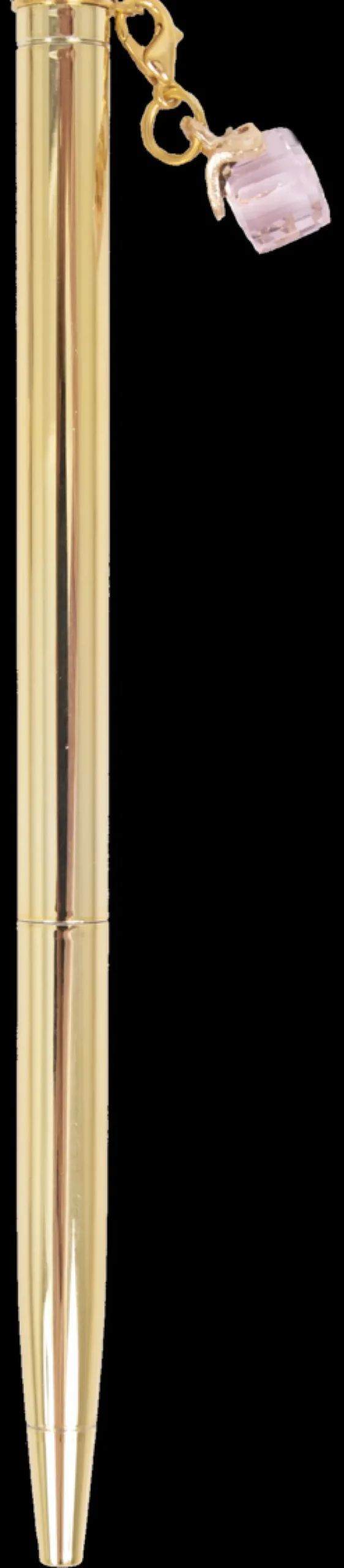 Oemotståndlig bläckpenna i guldfärgad metall, med en vacker rosa sten fäst på toppen av pennan. Bläckpennan har en bekväm klickfunktion, svart bläck och 1 mm spets. En snygg kulspetspenna som osar av lyx! Längd: ca 14 cm.