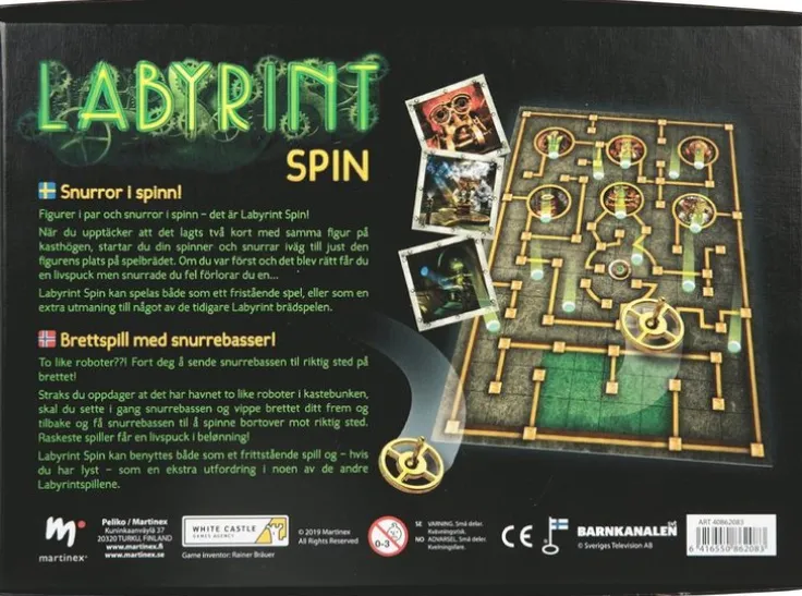 Figurer i par och snurror i spinn – det är Labyrint Spin! När du upptäcker att det lagts två kort med samma figur på kasthögen, startar du din spinner och snurrar iväg till just den figurens plats på spelbrädet. Om du var först och det blev rätt får du en livspuck men snurrade du fel förlorar du en… Labyrint Spin kan spelas både som ett fristående spel, eller som en extra utmaning till något av de tidigare Labyrint brädspelen. Regler på svenska och norska. 2–4 spelare, 15 min, 7+