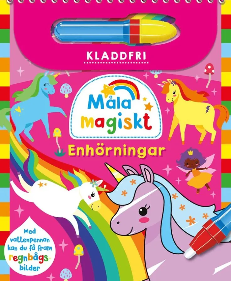 Upptäck en magisk värld med hjälp av vattenpennan! Häll vatten i den speciella pennan för att väcka enhörningarna till liv. När pappret torkar ser du färgen försvinna helt magiskt! Pennan är lätt att fylla på så att du kan måla om och om igen!