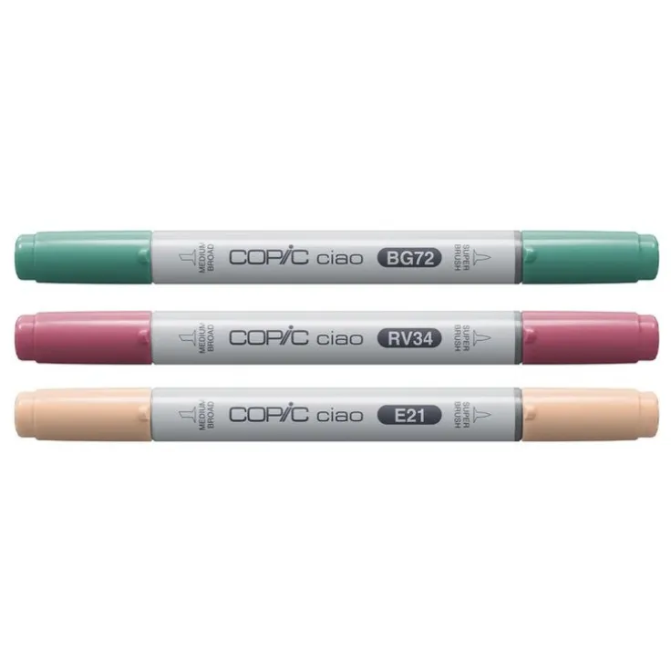 Copic Ciao är en professionell grafisk marker med två spetsar. Penselspets i ena änden och medelstor bred i andra, för mångsidiga penseldrag som ger fina detaljer och jämn täckning. Alla Copic Ciao är påfyllningsbara med bläck och spetsarna är utbytbara. Den är ultrablendbar och finns i 180 kulörer. Designad med barnsäkerhet i åtanke med perforerade korkar.