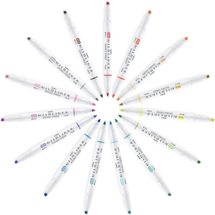 Vattenbaserad marker från Japanska Zebra i 15 unika och milda färger som ger ett mjukt resultat på pappret och blöder inte igenom. Det alldeles perfekta flödet gör pennan till förstahands valet för dig som vill väcka liv i din bullet journal eller för att färglägga i din målarbok. Pennorna fungerar på lite tunnare papper till skillnad från en vanlig marker som ofta kan blöda igenom och därför kräver tjockare blad. Mildliner är försedd med två spetsar, en bold och en fine, vilket gör den mångsidiga markern mycket användbar både vid färgläggning och överstrykning. Syrafri och giftfri.