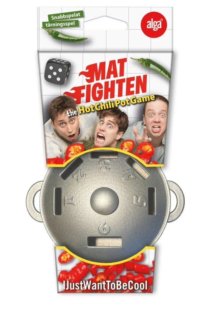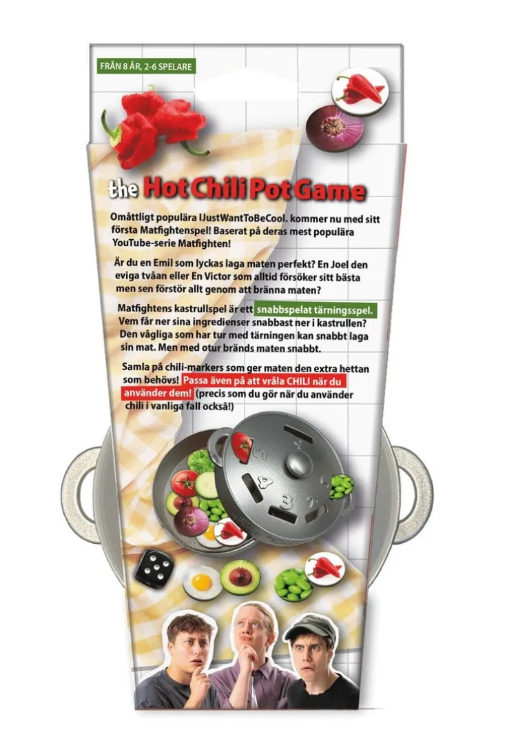 Omåttligt populära IJWTBC kommer nu med sitt första Matfightenspel! Baserat på deras mest populära YouTube-serie Matfighten!Är du en Emil som lyckas laga maten perfekt? En Joel den eviga tvåan eller En Victor som alltid försöker sitt bästa men sen förstör allt genom att bränna maten?Matfightens kastrullspel är ett snabbspelat tärningsspel. Vem får ner sina ingredienser snabbast ner i kastrullen? Den vågliga som har tur med tärningen kan snabbt laga sin mat. Men med otur bränns maten snabbt. Samla på chili-marker som ger maten den extra hetta som behövs! Passa även på att vråla CHILI när du använder dem! Ta med – The Hot Chili Pot Game på resan, till skolan eller till kompisarna och påbörja er alldeles egna Matfight!