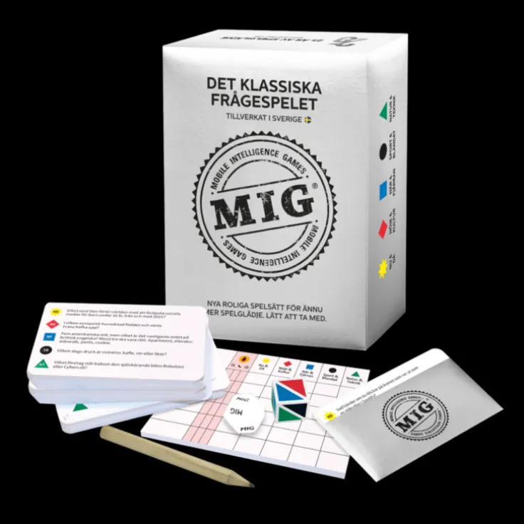 MIG klassiska frågespel i jubileums-upplaga. Spela på klassiskt vis eller med det nya roliga spelsättet där du kan få extra hjälp om du behöver. Med ”Räddaren i nöden” kan du ringa en kompis, söka på internet eller svara två gånger. I pubquiz-varianten används den nya spelkortsfickan och alla svarar på samma frågor. Spelet är lätt att ta med och innehåller aktuella frågor blandat med klassisk allmänbildning. Tillverkad i Sverige av Playmig. Innehåll: 780 frågor, kortficka, tärningar, block och penna. Speltid: Från 15 minuter. Antal spelare: 2-6, eller fler. Spela gärna i lag.