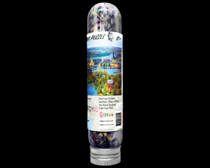 Lägg ett minipussel på 150 bitar med ett vackert motiv av Stockholm. När det är färdiglagt har det storleken av ett vykort (10×15 cm). Bild på motivet ligger i tuben.