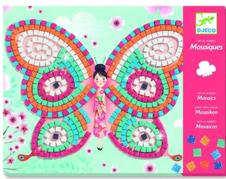 Barnpyssel där fjärilar ska dekoreras med mosaik. Det här barnpysslet från Djeco har självhäftande mosaikplattor som sätts på numrerade platser och skapar ett vackert fjärilsmotiv. Förpackningen innehåller två ark med fjärilsmotiv och sju ark med färgglada mosaikplattor. Allt som behövs för pysslet följer med i kartongen. Ett roligt pyssel som är enkelt att ta med sig!