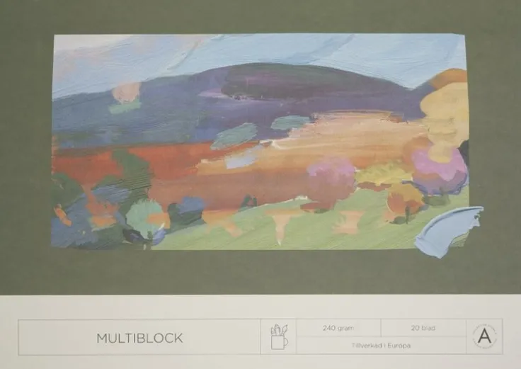 Multiblock i praktiskt A3 format som passar perfekt för att blanda olika tekniker. Dess 20 blad har en ytvikt på hela 240 gram som gör att de ska klara av all kreativitet du kan tänka dig – akryl, blyerts, pastell, bläck! Bladen är även limmade och enkla att riva av vid behov. Blocket har ett motiv föreställande ett abstrakt landskap mot en mörkgrön bakgrund. Blocket är Svanenmärkt och tillverkad i Europa.240 g papper20 bladSvanenmärkt Ett block, oändliga möjligheter. Multiblocket ingår i Akademibokhandelns egen kollektion – Kollektion Stora A.