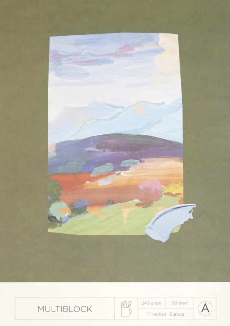Multiblock i A5 format med som passar perfekt för att blanda olika tekniker. Dess 20 blad har en ytvikt på hela 240 gram som gör att de ska klara av all kreativitet du kan tänka dig – akryl, blyerts, pastell, bläck! Bladen är även limmade och enkla att riva av vid behov. Blocket har ett motiv föreställande ett abstrakt landskap mot en mörkgrön bakgrund. Blocket är Svanenmärkt och tillverkad i Europa.240 g papper20 bladSvanenmärkt Ett block, oändliga möjligheter. Multiblocket ingår i Akademibokhandelns egen kollektion – Kollektion Stora A.