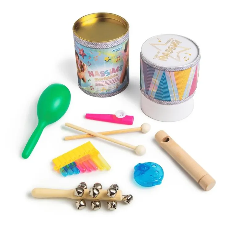 Nassims musiklåda, från 5 år. Här lär Nassim Al Fakir dig på ett lätt, kul och lekfullt sätt att bygga ett musikstycke med rytm, skak och melodi. Den cylinderformade lådan konverteras till två trummor, och innehåller massor av roliga instrument att testa och experimentera med. Inga förkunskaper krävs! Du får också tips om hur man skapar en cool scenimage!