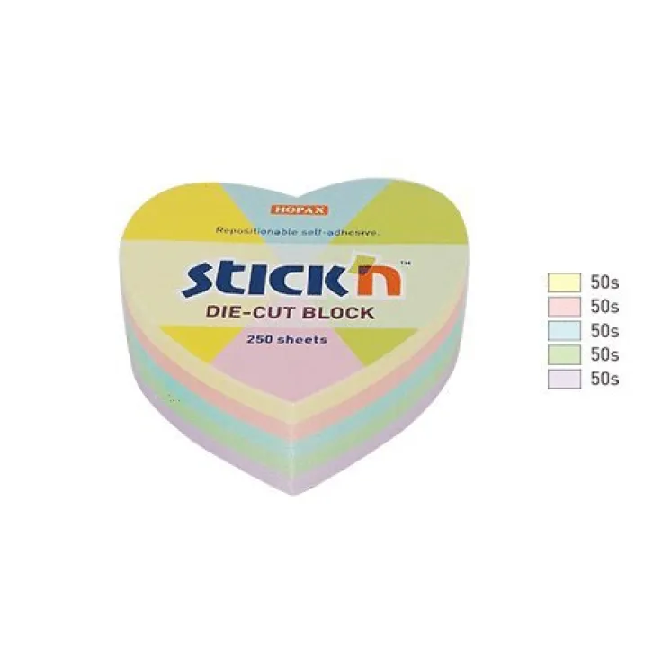 Hjärtformade notisblock i härliga pastellfärger. Bästa notisblocket för de personliga meddelanden. Fäster överallt om och om igen utan att skada underlaget. 250 ark i 5 olika färger 64x67mm.