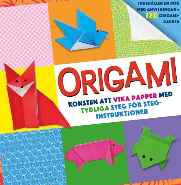 Origami är den japanska konsten att vika papper som har använts i hundratals år. Med origami kan du skapa en hel värld av detaljrika skulpturer med ett enda papper och utan att klippa eller klistra. Här får du lära dig att steg för steg vika många olika origami- figurer med hjälp av anvisningarna i den inspirerande boken och 120 färgglada origamipapper.