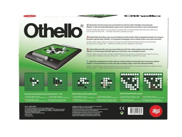 Othello med svarta och vita spelmarkörer och klassiskt grönt bräde, från Alga. Tränar ditt logiska tänkande. Othello bygger på en enkel spelidé som är snabb att lära sig, men det tar år av träning att lära sig de taktiska dragen. Lås in din motståndares brickor och vänd dem till dina. Den som har flest brickor vid spelets slut vinner. Se film här!