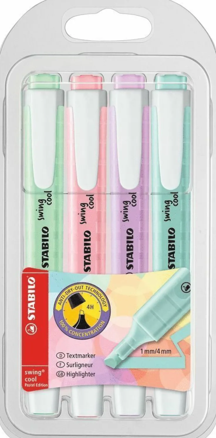 STABILO swing cool är en av marknadens mest sålda ”passar-i-fickan”överstrykningspennor. Perfekt för studenter och de som har en mobil arbetsplats, eftersom korken har liten klämma som kan fästas i fickan. Pennkroppen har en greppvänlig yta. STABILO swing cool har har 4 timmars ”cap off tid”. Två skrivbredder: 1 + 4 mm. Här i 4 pastellfärger