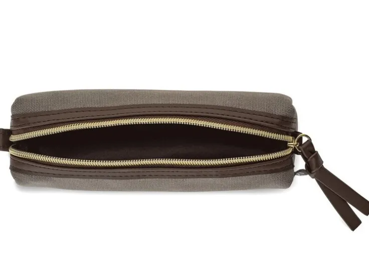 Pennfodral i återvunnen canvas med detaljer i konstläder, som den förstärkande kanten längs med dragkedjan, de smidiga greppen i vardera änden av dragkedjan och det snygga handtaget som öppnar och stänger dragkedjan. Pennfodralet är fodrat i matchande grå färg och dragkedjan är i guldfärg. Ett riktigt fint pennfodral som kommer hänga med länge!
