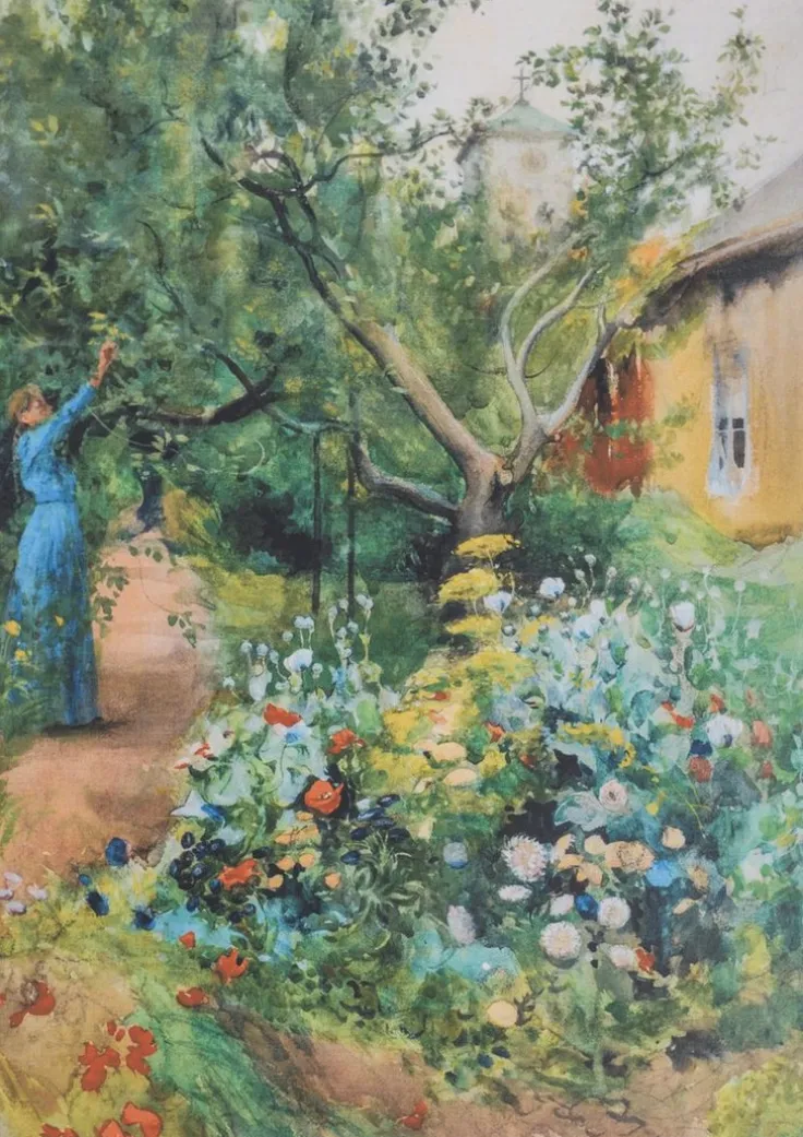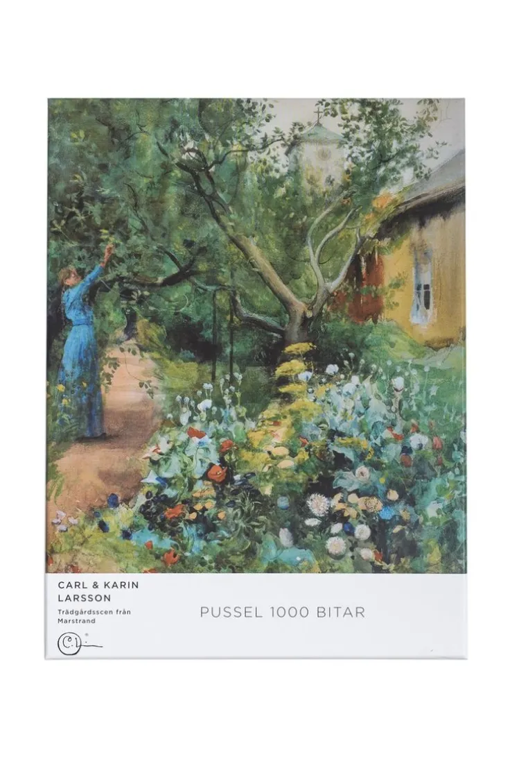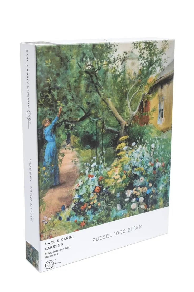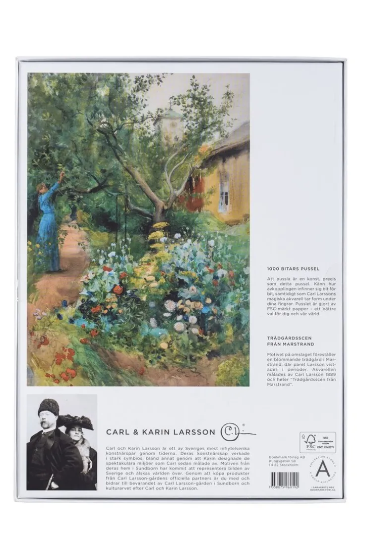 Att pussla är en konst, precis som detta 1000 bitars pussel. Känn hur avkopplingen infinner sig bit för bit, samtidigt som Carl Larssons magiska akvarell tar form under dina fingrar. Motivet föreställer en blommande trädgård i Marstrand där Carl och Karin Larsson vistades i perioder. Akvarellen målades 1889 och heter ”Trädgårdsscen från Marstrand”.Mått förpackning: 25x34x5 cm.Mått lagt pussel: 48×68 cm.Tillverkad av FSC®-märkt papper, ett bättre val för dig och vår värld.Carl och Karin Larsson är ett av Sveriges mest inflytelserika konstnärspar genom tiderna. Deras konstnärskap verkade i stark symbios, bland annat genom att Karin designade de spektakulära miljöer som Carl sedan målade av. Motiven från deras hem i Sundborn har kommit att representera bilden av Sverige och älskas världen över. Genom att köpa produkter från Carl Larsson-gårdens officiella partners är du med och bidrar till bevarandet av Carl Larsson-gården i Sundborn och kulturarvet efter Carl och Karin Larsson. Nu i ett unikt samarbete med Akademibokhandeln för vår egen kollektion – Kollektion Stora A.