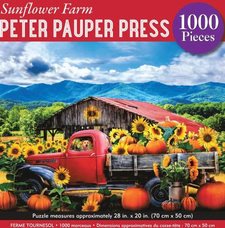 Pussel med 1000-bitar i en stadig, fyrkantig och mycket fin ask. Pusselbitarna är i kraftig kartong och med en yta i linnestruktur, som minskar ljusreflektioner och gör att pusselbitarna är behagliga att hålla i. Asken innehåller en exakt bild av det färdiga pusslet, som är bra att ha tillhands som referens. Det färdiga pusslet är 71 x 51 cm stort. På pusslet en krispig bild av fält med solrosor, pumpor och vackra vyer. Bilden har fina och tydliga färgfält som gör pusslandet både intressant och roligt att lägga.